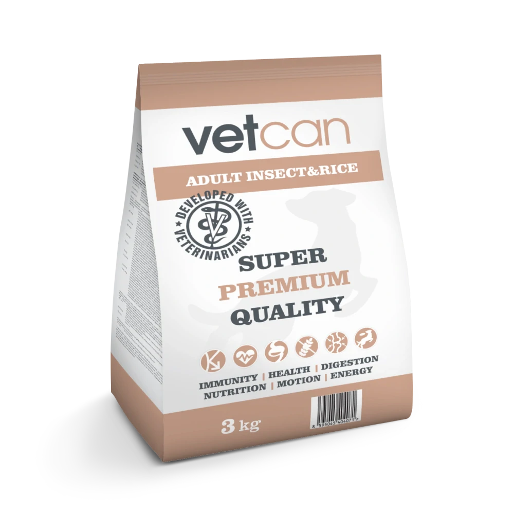 Vetcan Insect je kompletné krmivo pre dospelé psy s citlivým tráviacim traktom alebo trpiace alergickými reakciami na krmivo. Kombinácia proteínu z hmyzu a ryže znižuje riziko intolerancie alebo alergickej reakcie na živočíšne alebo rastlinné zložky krmiva.